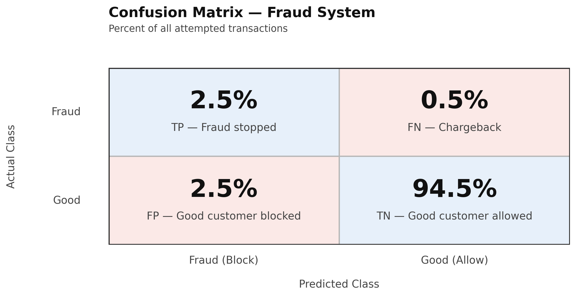 The other 95% of transactions go through (predicted negatives). Of those, 0.5% are chargebacks (False Negatives) and 94.5% are legitimate (True Negatives).