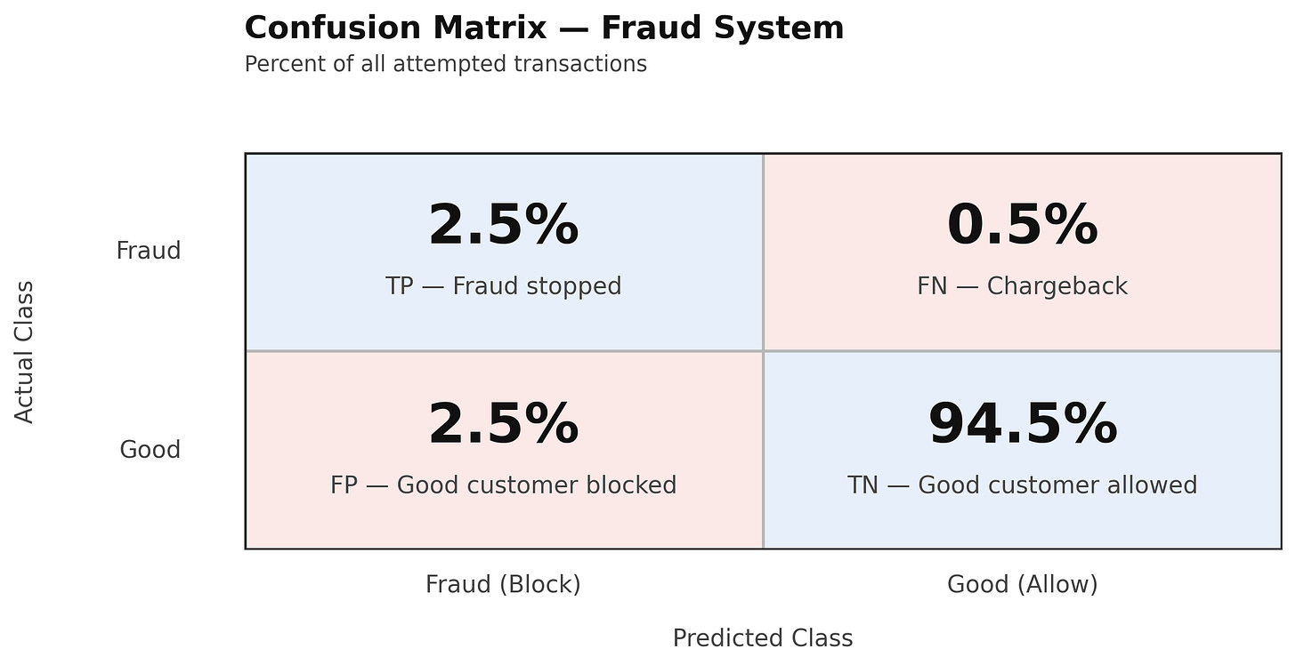 That 5% is evenly split between good customers we blocked (2.5% False Positives) and fraudsters we stopped (2.5% True Positives).