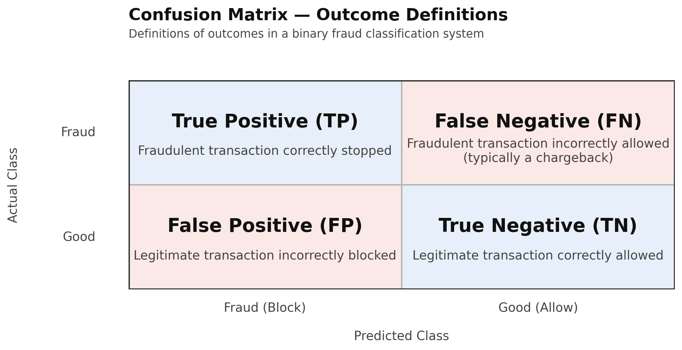 We now have our four potential states. To understand how a classification system performs, ML practitioners use a simple chart called the confusion matrix, which buckets transactions by the actual (y-axis) and predicted (x-axis) classes: