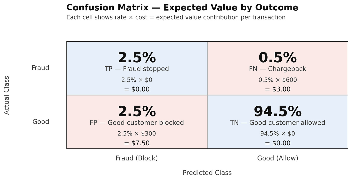 We can now combine the confusion matrix with the costs we’ve defined to calculate the expected value (EV) — the average cost of fraud per transaction.